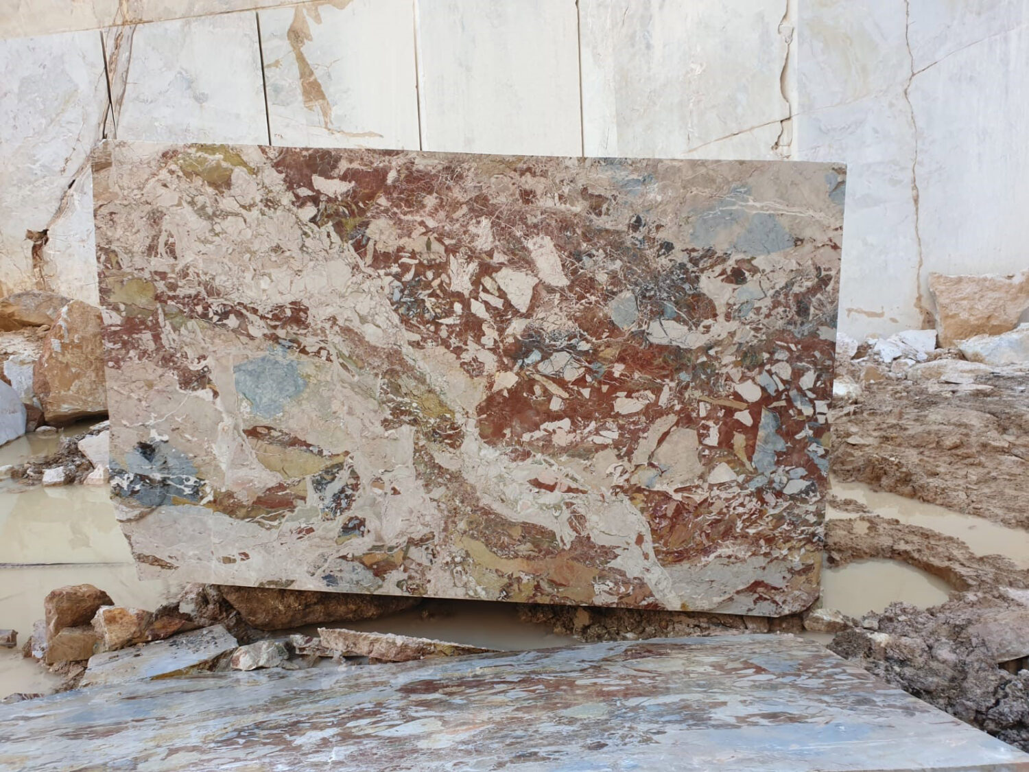 Breccia Diaspro Marble is a Marble with a polished finish. This rare Italian breccia marble has extraordinarily strong tones of red, rust, yellow and gold with sharp white veins. Breccia Diaspro Marble is a unique marble that is best for indoor applications such as kitchen countertops, bathroom counters, fireplaces and custom furniture.