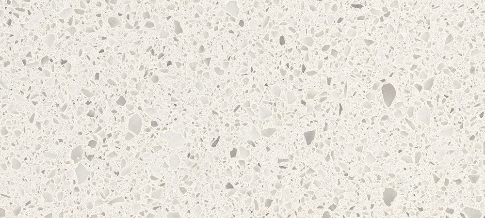 Chunky, course-grained texture and neutral-colored quartz chips on a white stone background.